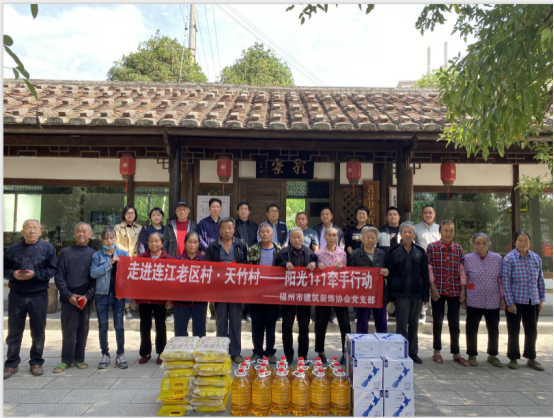 共商脫貧,鄉村振興。10月24日上午,在重陽節來臨之際,福州市建筑裝飾協會支部書記陳金敏、會長何世根(福州鵬程建筑裝修設計工程有限公司)、監事長俞若明(福建省天閩建筑裝飾有限公司)、秘書長劉小麗及會員代表:福建人文裝修建筑工程有限公司、福建新康輝工程發展有限公司、福建永盛設計裝飾工程有限公司、福建華居建設工程有限公司、錦楠建設集團有限公司、福建敖海建筑工程有限公司、福建藍海怡建設有限公司等一同前往連江縣東湖鎮-天竹村。