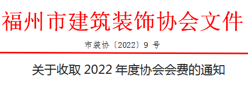 感謝您長期以來對協會工作的支持和幫助,為保證協會各項工作順利開展,更好地為會員企業提供服務,根據《福州市建筑裝飾協會章程》及第五屆二次會員大會通過的《福州市建筑裝飾協會會費標準》有關規定,即日起開始2022年度會費收取工作。現將有關事項通知如下: