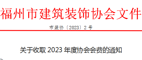 感謝您長期以來對協會工作的支持和幫助,為保證協會各項工作順利開展,更好地為會員企業提供服務,根據《福州市建筑裝飾協會章程》及《福州市建筑裝飾協會會費標準》有關規定,即日起開始2023年度會費收取工作。現將有關事項通知如下: