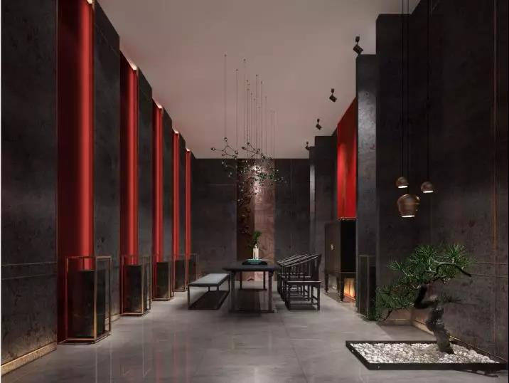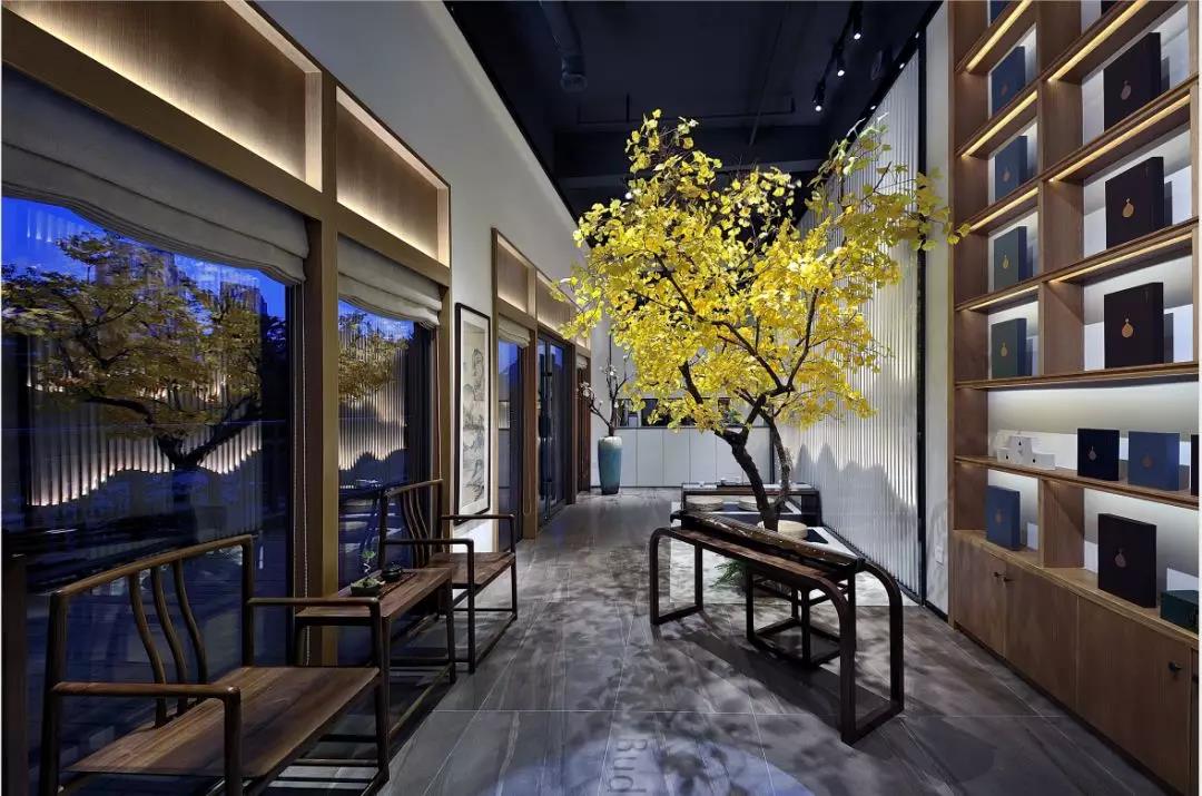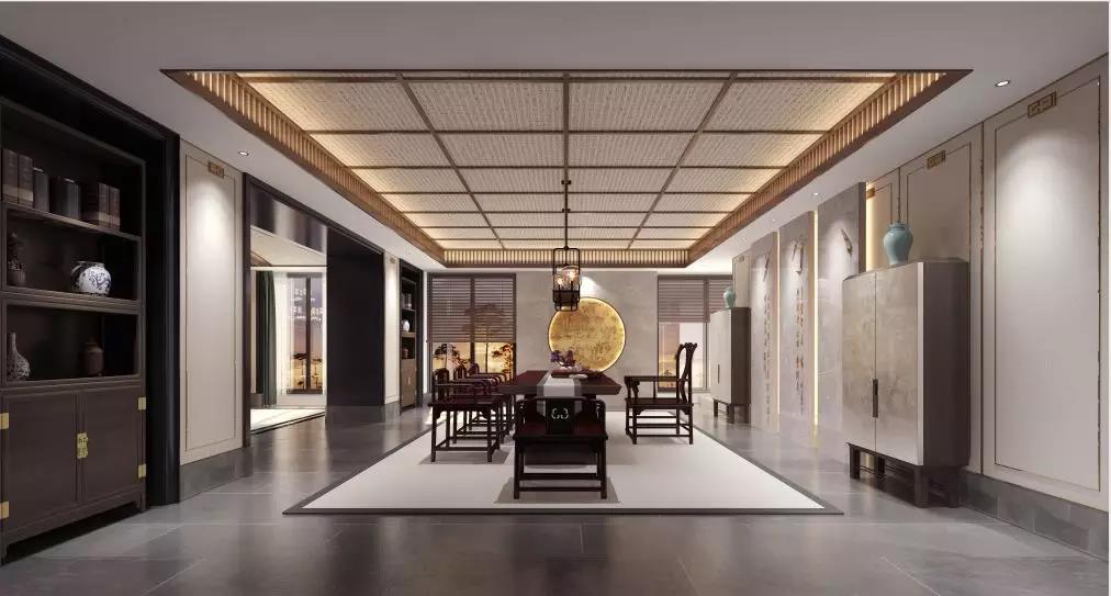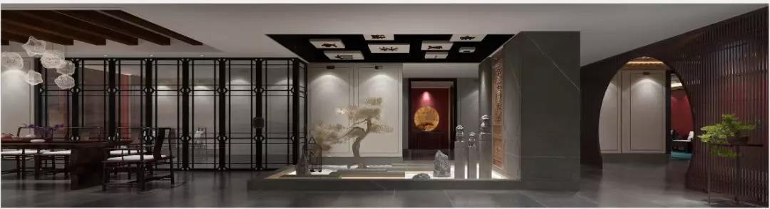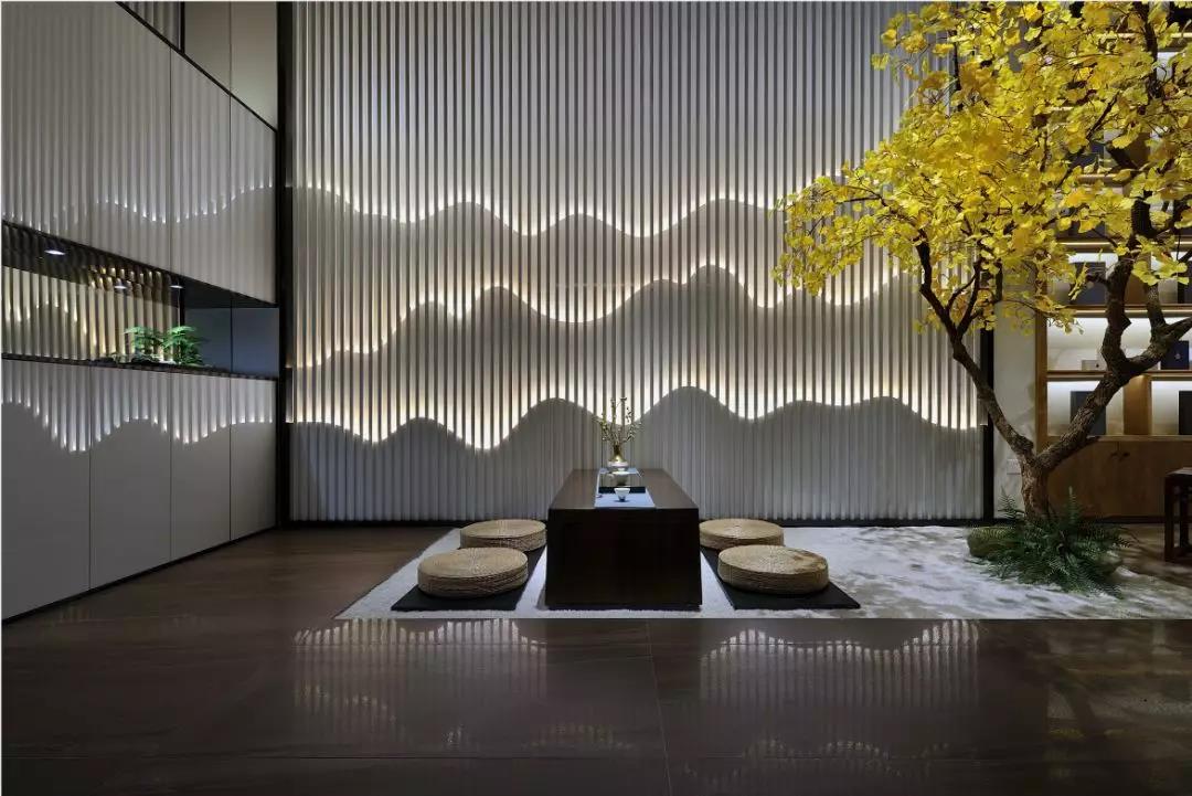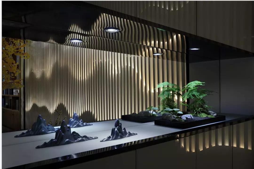 十方無(wú)影像,六道絕形蹤。跳出三界外,不在五行中。一著高一著,一步闊一步。坐斷佛祖關(guān),迷卻來(lái)時(shí)路。本案設(shè)計(jì)中,將中式茶文化的陳設(shè)與周遭環(huán)境華麗結(jié)合,交相呼應(yīng)。廳中的月洞別具一格,不僅拓展了視野滿足了空間的一體化,也衍射出大同之道。入口邊柜中間的鏡面“倒影”出獨(dú)特的格柵飾面背景墻,使其被賦以水墨河山的詩(shī)情畫(huà)意,給人一種“深林人不知,明月來(lái)相照”的閑靜幽遠(yuǎn)。軟膜、木線條與燈帶交織而出的吊頂,則更是極致地運(yùn)用了光和影,襯托出“出塵”與“入世”的截然不同。如是,空間的層次感烘云托月,體現(xiàn)了“向禪”對(duì)生活的追求和理想向往。《國(guó)史補(bǔ)》記,禪茶一味;向禪即向茶,參禪即參茶;品茶亦品禪,敬茶亦敬禪。恬淡安靜,超然平淡,讓心靈回歸本真,便是人生,便是禪