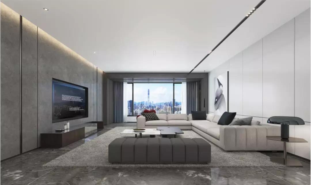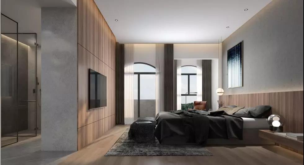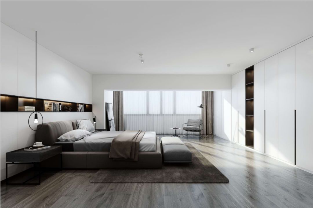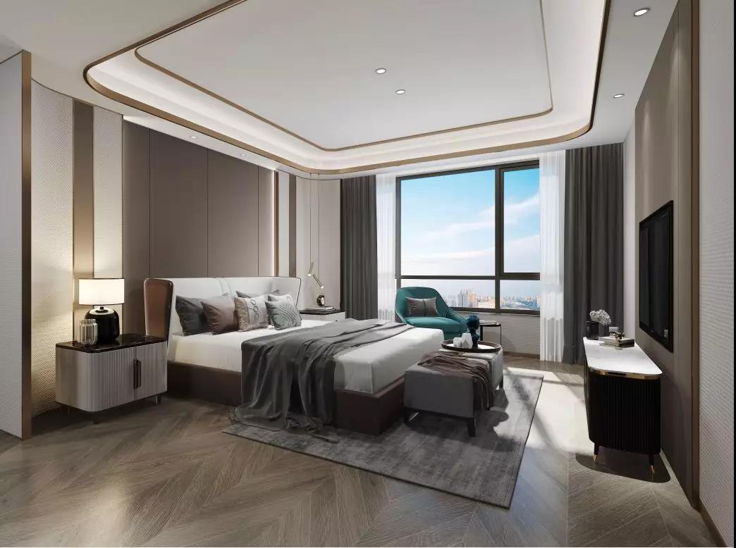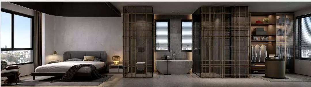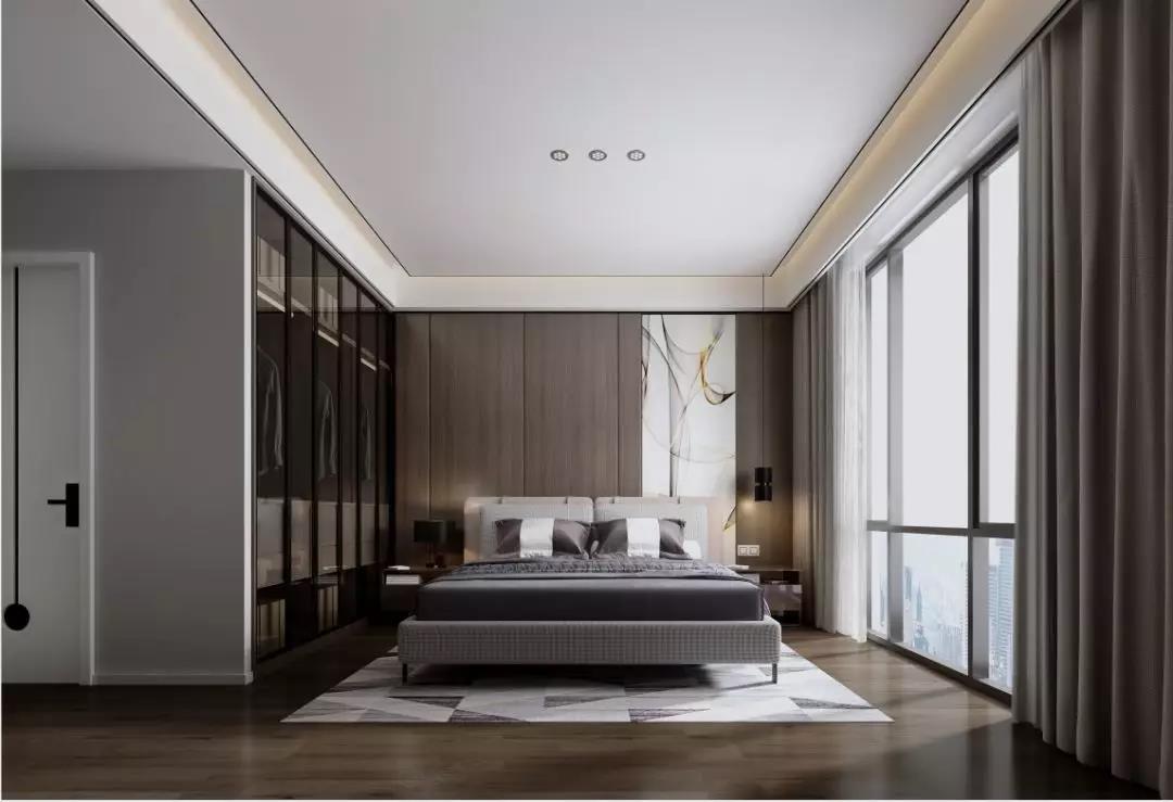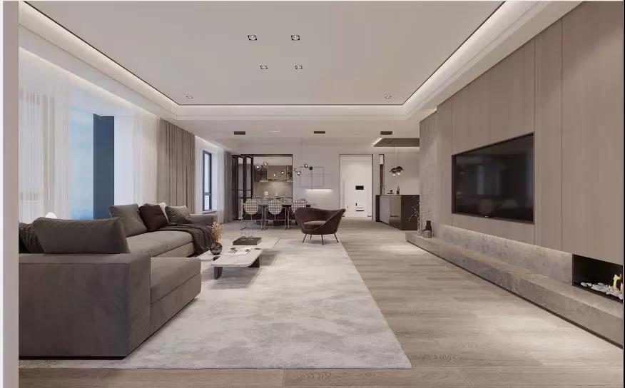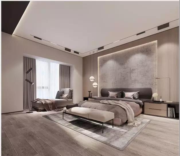 客廳采用溫暖的木質和低冷色調的黑鈦,搭配整體灰色沙發/窗簾與深色地毯使得整體空間更寬敞明亮,與地面整體造型相呼應,主臥淺灰墻板搭配灰色床鋪、深灰色窗簾搭配形成整體黑白灰色,讓整體風格更簡約化,更時尚化