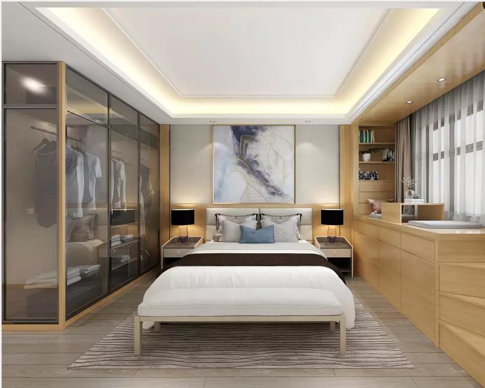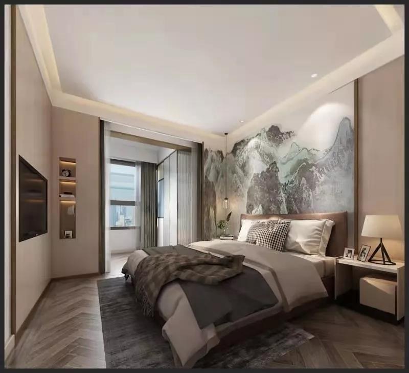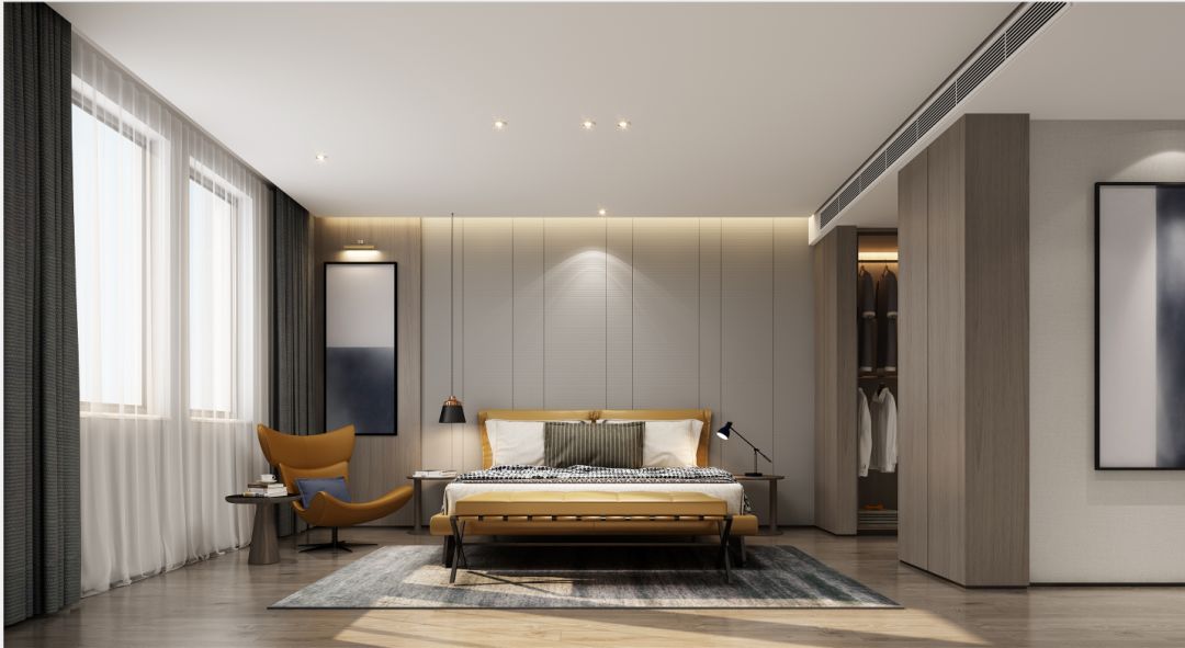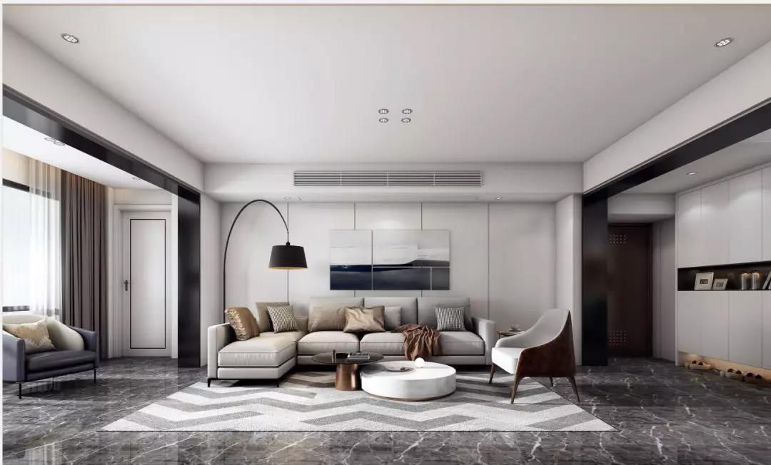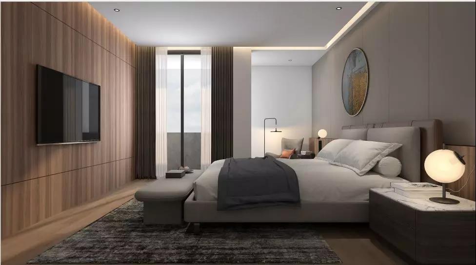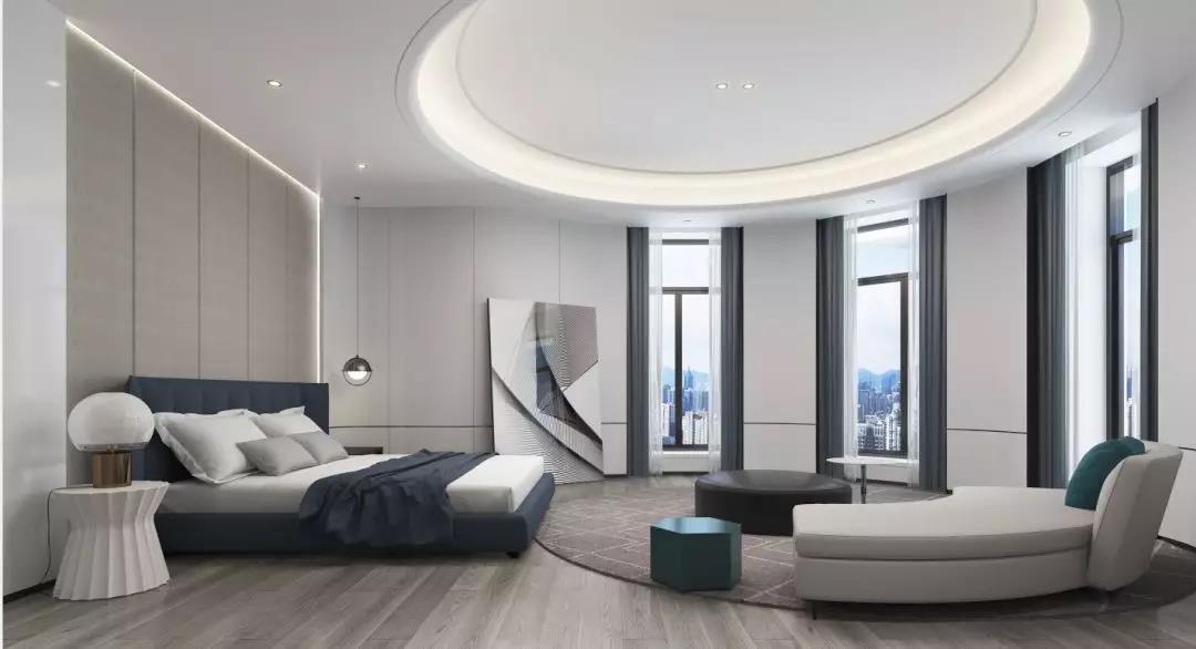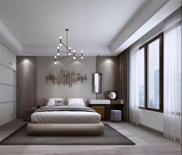 客廳采用溫暖的木質和低冷色調的黑鈦,搭配整體灰色沙發/窗簾與深色地毯使得整體空間更寬敞明亮,與地面整體造型相呼應,主臥淺灰墻板搭配灰色床鋪、深灰色窗簾搭配形成整體黑白灰色,讓整體風格更簡約化,更時尚化