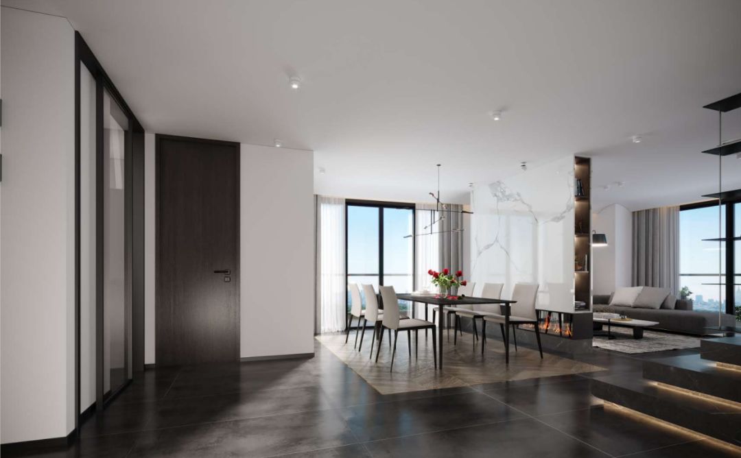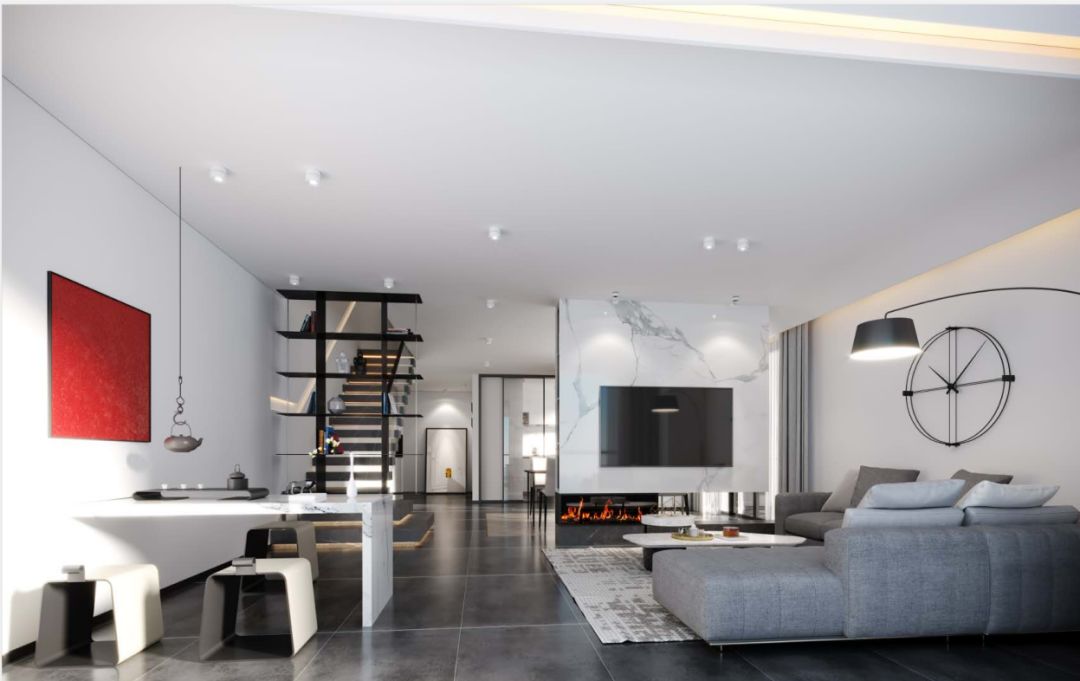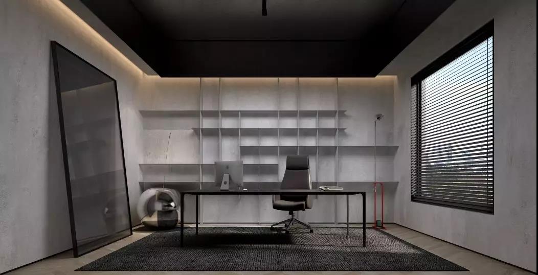 本項目以單人豪宅作為主要設計定位,目標客戶群體為31-45歲事業有成的都市獨身男性。在功能設置上,根據客戶群體行為、生活方式采用較為敞開的布局形式,梳理整合為公與私兩大生活區塊,并詳盡規劃互聯網時代精細化住宅系統,且同時滿足視野開闊與流暢的動向兩大起居訴求,最大限度上提升居者的生活品質;而在設計手法方面,讓部分墻體與吊頂產生弧度異變、在統一的冷靜灰調視覺效果下構筑盒狀空間、線性鋼架;同時,藝術裝置的植入亦或是進行厚重墻體與灰鏡、灰玻等材質的合理穿插,兩者共同營造出虛實結合、現代簡約的空間氛圍,旨在提供都市喧囂后的一片休憩凈土,在燈火闌珊處靜待居者歸來。