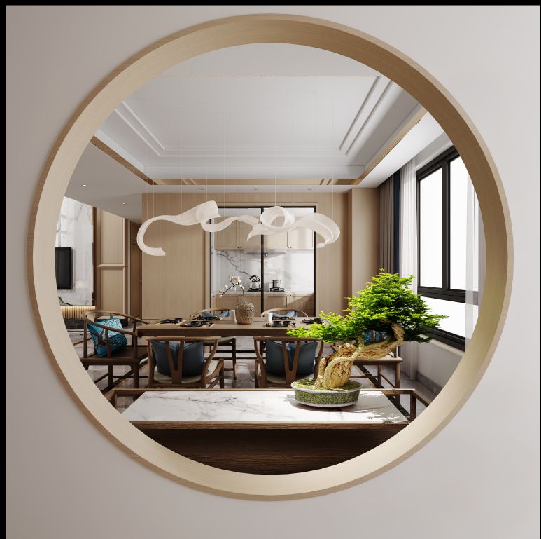 “一花一世界,一木一浮生”禪意是一種美,一種境界,是空靈、靜穆、深遂、幽遠。 本案以園林“借景”手法貫穿整案設計,讓各個空間均有景可觀,穿透的視線也契合當下開放式的生活主題。將傳統的“月窗” 、“山水”、 “水墨畫” 、“造景”等中式元素,通過提煉以更簡潔的表現形式展現空間的中式意境,同時加入金屬、木面、大理石材質的應用賦于空間的時尚面貌,在傳統與現代間依然能體現雅致的平衡,為居住者帶來品質、趣味和輕松使其生活變的更美好
