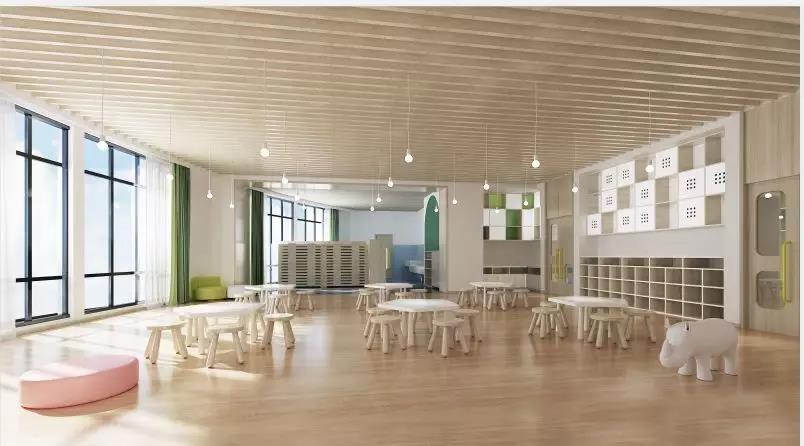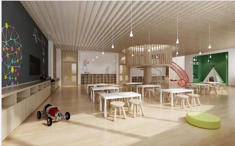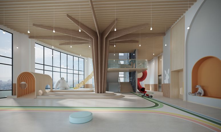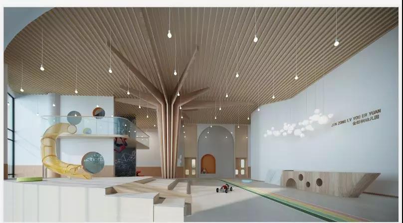 對于幼兒園設計應該更多是的返璞歸真,歸于童真與自然,給人的印象就是“樸素”,因為孩子們更傾向于在自然環境下的潛能及創新精神的挖掘。本案大量色彩自然柔和的木質板材并有大面積的窗戶,自然光線與天花板的木格柵,一同烘托出明亮的室內環境。室內與室外操場都是孩子們親近自然的理想場所。內部設施簡單,大部分空間都可以進行功能轉換,有大量空曠的空間供小朋友自由互動,空間與空間之間各有互動聯系,操場下層空間設計小小荷塘感受夏日走在鄉間野外小池塘,在屋頂還設計了種植蔬果體驗區,整區設計理念就是給予孩子們更多的親近自然,在自然中感受四季萬物變化,我們帶著童心與孩子們在一個不受拘束的空間里一起成長。