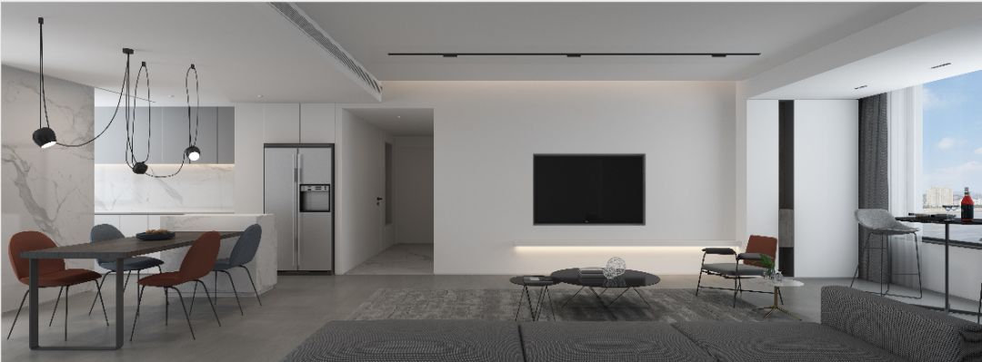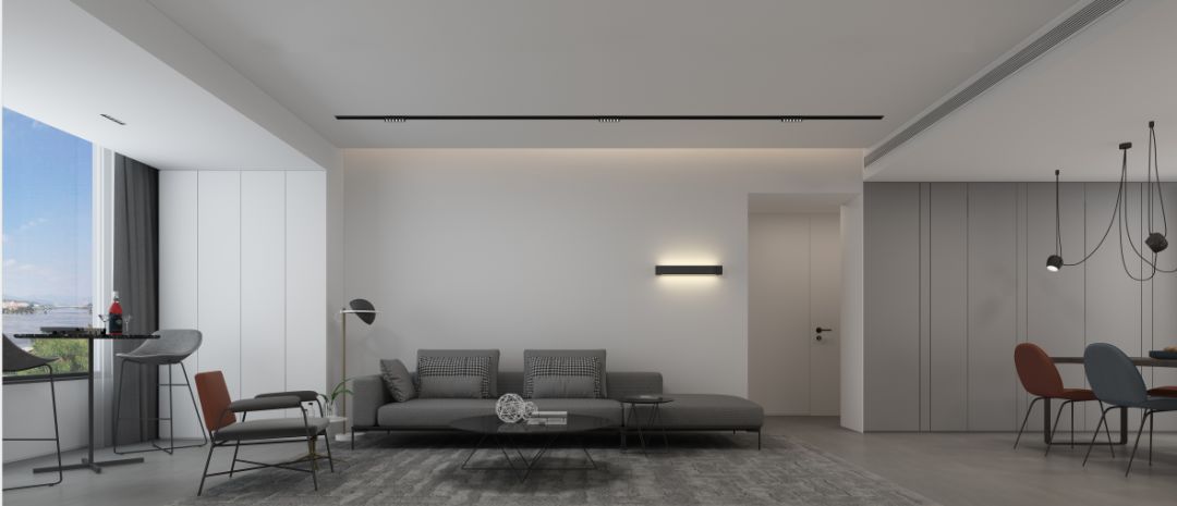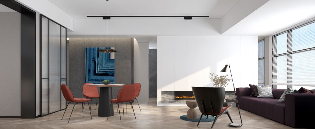 家的設(shè)計承載的更多可能,不僅是傳統(tǒng)意義上的遮風(fēng)避雨,更多的而是心靈上的放下。設(shè)計師通過比例、線條、色彩、質(zhì)感等一切的介質(zhì),探索著更多屬于當(dāng)代生活方式的表達(dá)。灰色巖板與潔白大理石餐桌,搭配橘色椅子。進(jìn)門移門式入戶隔斷,靈活切換空間私密性和通透感;客廳以白色烤漆核心,搭配藍(lán)色的線條造型讓空間顯得更加簡潔。設(shè)計師采用現(xiàn)代高純度色彩對比的設(shè)計格調(diào),這看似簡單的搭配卻以極致的當(dāng)代設(shè)計美學(xué)手法呈現(xiàn),充分體現(xiàn)空間的個性美感。柔軟的沙發(fā)弧度,木質(zhì)的深色單椅子搭配上橘紅色的皮質(zhì)就像清晨破云而出的朝陽,給人朝氣蓬勃的感覺,讓安靜的客廳變得溫曖有生機(jī)。木地板的溫潤氣質(zhì)使整體空間更加契合,在豐富空間的同時,不破壞空間的整體性;在強(qiáng)調(diào)現(xiàn)代感與藝術(shù)感相結(jié)合的同時,更多的保留舒適感。帶出了家溫馨的一面,同時也彰顯了設(shè)計師對燈光的熟練運用。