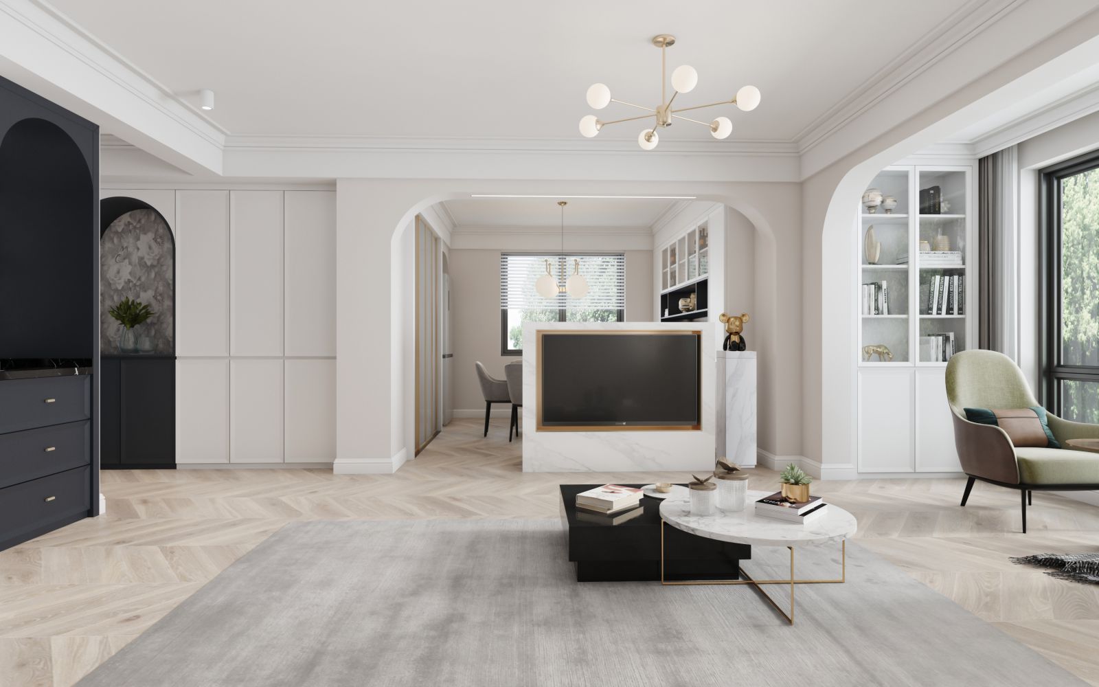 設計說明:本案的屋主是一對即將退休的夫妻,她們希望以后的生活環境能以簡凈雅致為主基調,反復溝通之后敲定了本案以美式輕奢的設計風格為主。整體的室內設計沒有過多復雜的空間布局,即使褪去所有家具軟裝僅存留硬體結構,仍透散著優雅純凈韻味。檢視既有格局后,將原三房調整成二房,釋放客廳與餐廳朗闊視野,同時挹注經典美式元素,透過石膏線條、巖板、黃銅與拱門語匯細琢出典雅氣息。同步搭配經典現代家具,借其簡練線條與古典元素相互碰撞,筑構出耐人尋味的自然美感,并于全室飾以柔美粉白色調,以干凈俐落手法精準呈現美式風格獨有的簡美大器底蘊。
