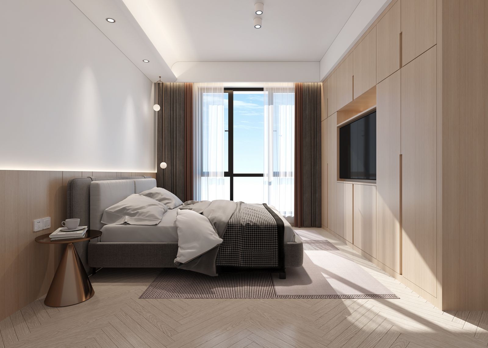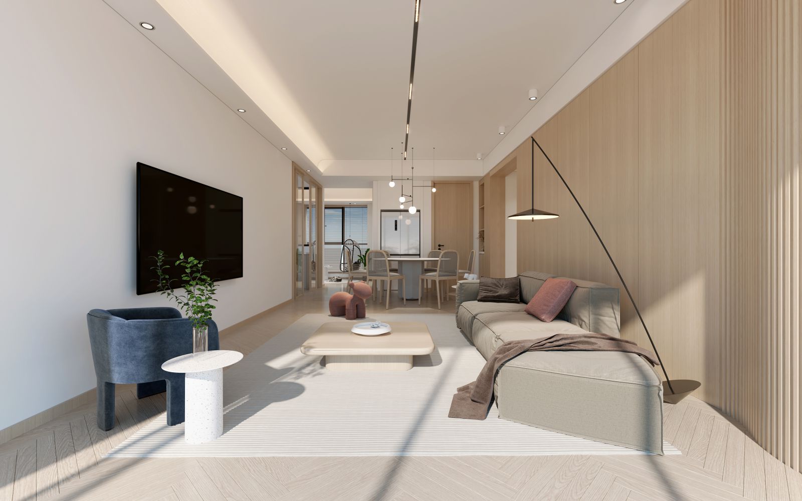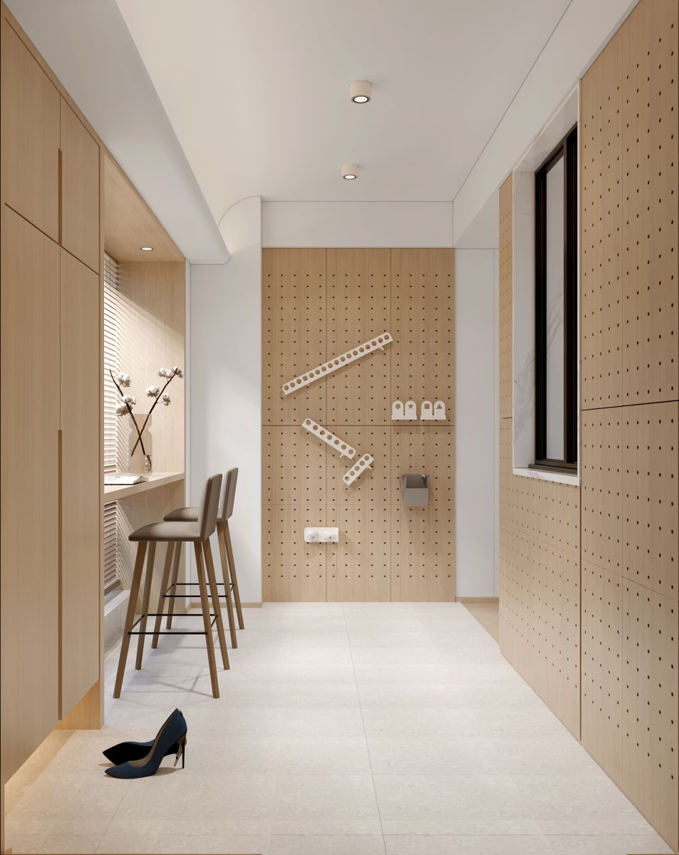 設計說明:在宣泄的世界里,高速發展的科技使我們的很多需求的到了滿足。同時賦予一種全新的生活方式。回溯在現實生活中,我們業主更喜歡在低調的氣氛中隱隱再現。客餐廳活動區域開放通透之動線延伸至陽臺,延展出介于室內外的共存空間,讓陽光的溫度灑入沙發,光的穿透張力,成為定調空間的一個重要元素。入戶門廳充當著多功能廳、水吧臺、閱讀區;一口小點心、一口親手沖磨的咖啡相當滿足;墻身的洞洞板插上木條,可以種植多肉、也可以玩積木,根據需要而改變聯系著家人、親子之間的活動,主臥室晨起時沾附著紗簾引入的日光,隨意坐在單椅翻閱吳爾芙的著作,純粹簡單,卻是最為戀慕的靜美好景。