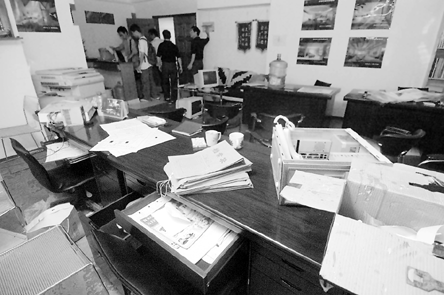 昨日下午5時半左右,記者接到業內人士報料趕赴現場時,逸品居裝飾位于福州市五四路的華城國際25層的辦公室內,幾臺電腦已經被翻得亂七八糟,而大部分主機內部配件已經被取走,只剩下空殼,辦公室文件、檔案袋、客戶名片、企業獲獎牌匾、錦旗等,散落得凌亂不堪。