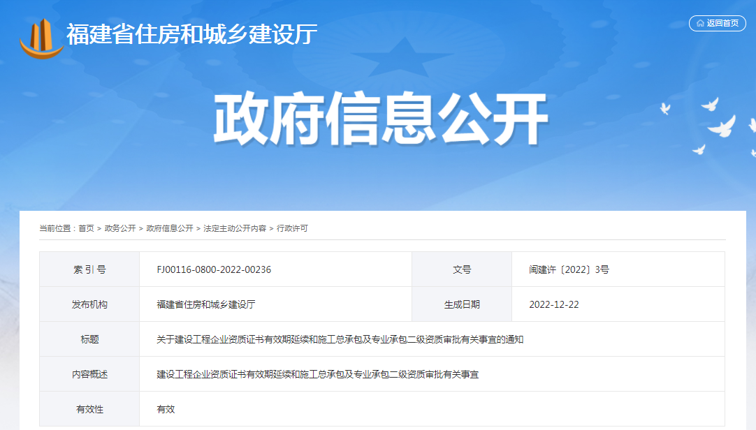 一、我省各級資質(zhì)審批部門審批的工程勘察、工程設(shè)計、建筑業(yè)企業(yè)、工程監(jiān)理企業(yè)資質(zhì),資質(zhì)證書有效期于2023年12月30日前期滿的,統(tǒng)一延期至2023年12月31日。企業(yè)無需換領(lǐng)資質(zhì)證書,原資質(zhì)證書仍可用于工程招標(biāo)投標(biāo)等活動。上述四類資質(zhì)證書統(tǒng)一延期后的有效期,可以在住建部全國建筑市場監(jiān)管公共服務(wù)平臺和省廳官網(wǎng)(http://zjt.fujian.gov.cn/)“首頁-福建省建設(shè)行業(yè)信息公開平臺-企業(yè)信息查詢。按照“誰審批誰負(fù)責(zé)”原則,各級資質(zhì)審批部門要及時做好所在地企業(yè)資質(zhì)證書信息與省廳官網(wǎng)“福建省建設(shè)行業(yè)信息公開平臺”的對接和更新工作。