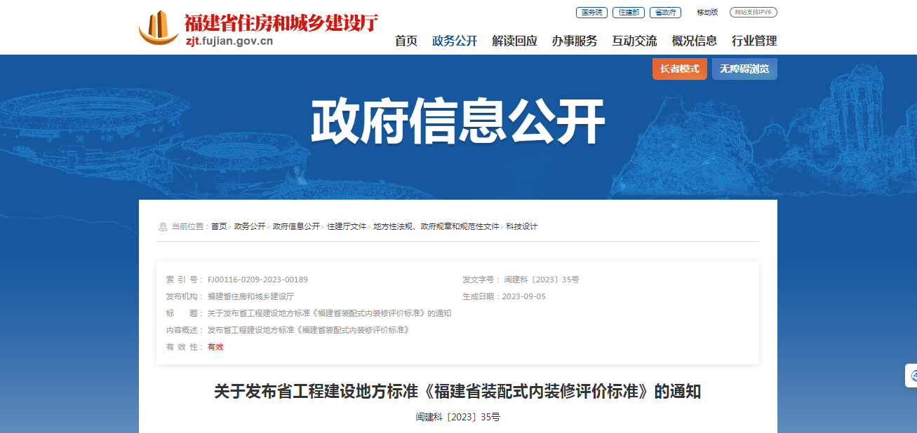 由福建省建設工程造價總站、中建海峽建設發展有限公司、方圓建設集團有限公司編制的《福建省裝配式內裝修評價標準》,經組織審查,批準為福建省工程建設地方標準,編號DBJ/T 13-428-2023,自2024年1月1日起實施。在執行過程中,有何問題和意見請函告省廳科技與設計處。