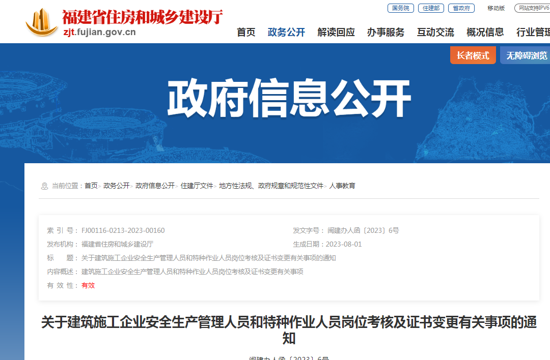 根據住建部推行電子證照要求和《福建省行政許可事項清單(2023年版)》,對建筑施工企業安全生產管理人員(以下簡稱“安管人員”)崗位考核、證書變更和建筑施工特種作業人員崗位設定作了調整,現就有關事項通知如下: